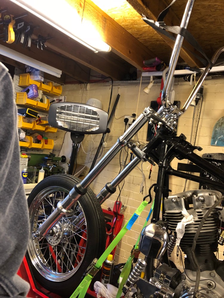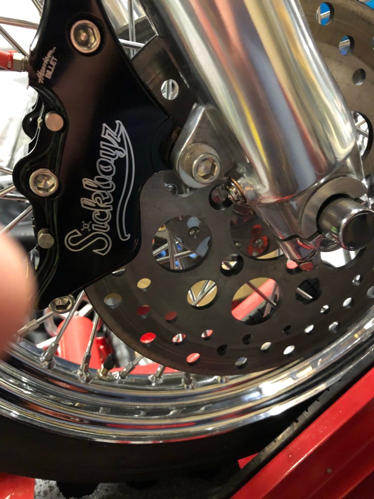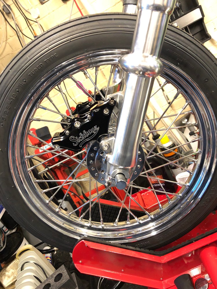 New Front End 2″ over wide glide forks with beefier tubes than standard. Twin disc-set up retained. New spoke wheel replaces cast. Harrison Billet ‘Sickboyz’ calipers 15″ apes
